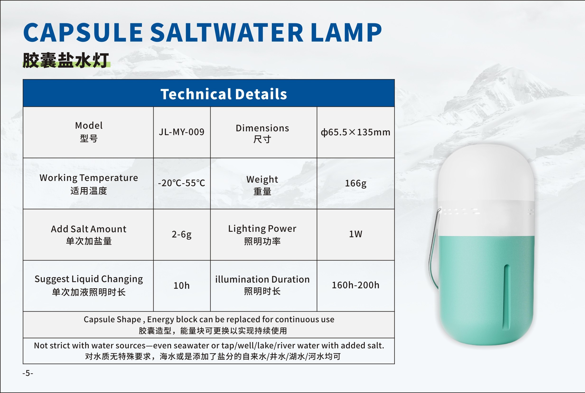 This product is powered by a saltwater-air electrochemical reaction—no charging required, not strict with water sources-even seawater or tap water,well water,lake water,river water with added salt,energy block can be replaced by the included tool for continuous use,suitable for various scenarios such as home use,outdoor camping,emergency lighting.